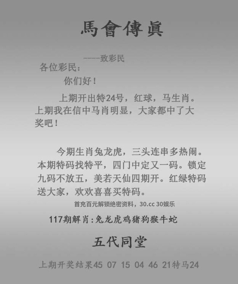 | 117期:马会传真解析: 今期生肖兔龙虎,三头连串多热闹 本期特码找特平,四门中定又一码 锁定九码不放五,美若天仙四期开 红绿特码送大家,欢欢喜喜买特码 五代同堂 解:今期生肖兔龙虎,三头连串多热闹,明肖兔龙虎,3头,本期特码找特平,四门中定又一码,4门,锁定九码不放五,美若天仙四期开,吉美肖兔龙羊鸡马蛇,红绿特码送大家,欢欢喜喜买特码,红绿波。 综合生肖:兔龙虎羊鸡马蛇狗猴 |